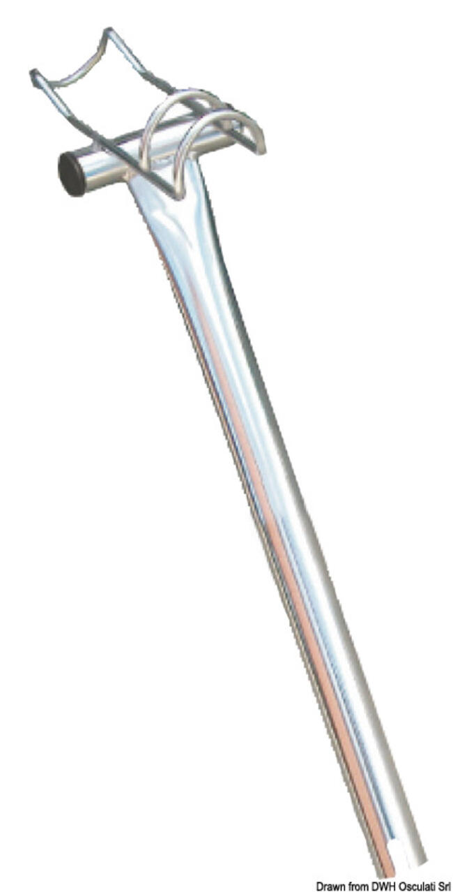 Orientabile in qualsiasi direzione. Si toglie e si mette in pochi secondi, universale. Completo di boccola in gomma e di spina ferma canna. Tutto in acciaio inox AISI 316, base e tubo.