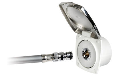 Vano doccia in acciaio inox AISI 316 con sportello autoreggente. Dotato di doccia Tiger in acciaio inox e boccola interna in gomma antivibrante.