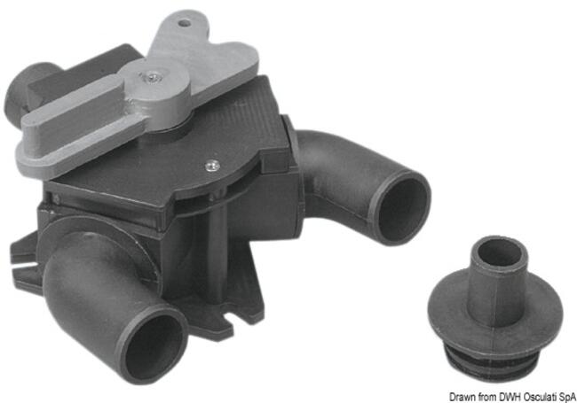 Utile per svuotare i serbatoi di deposito delle acque nere. Bocca entrata 38 mm, uscita 25 mm. Certificato CE in accordo alla EN ISO 8846.